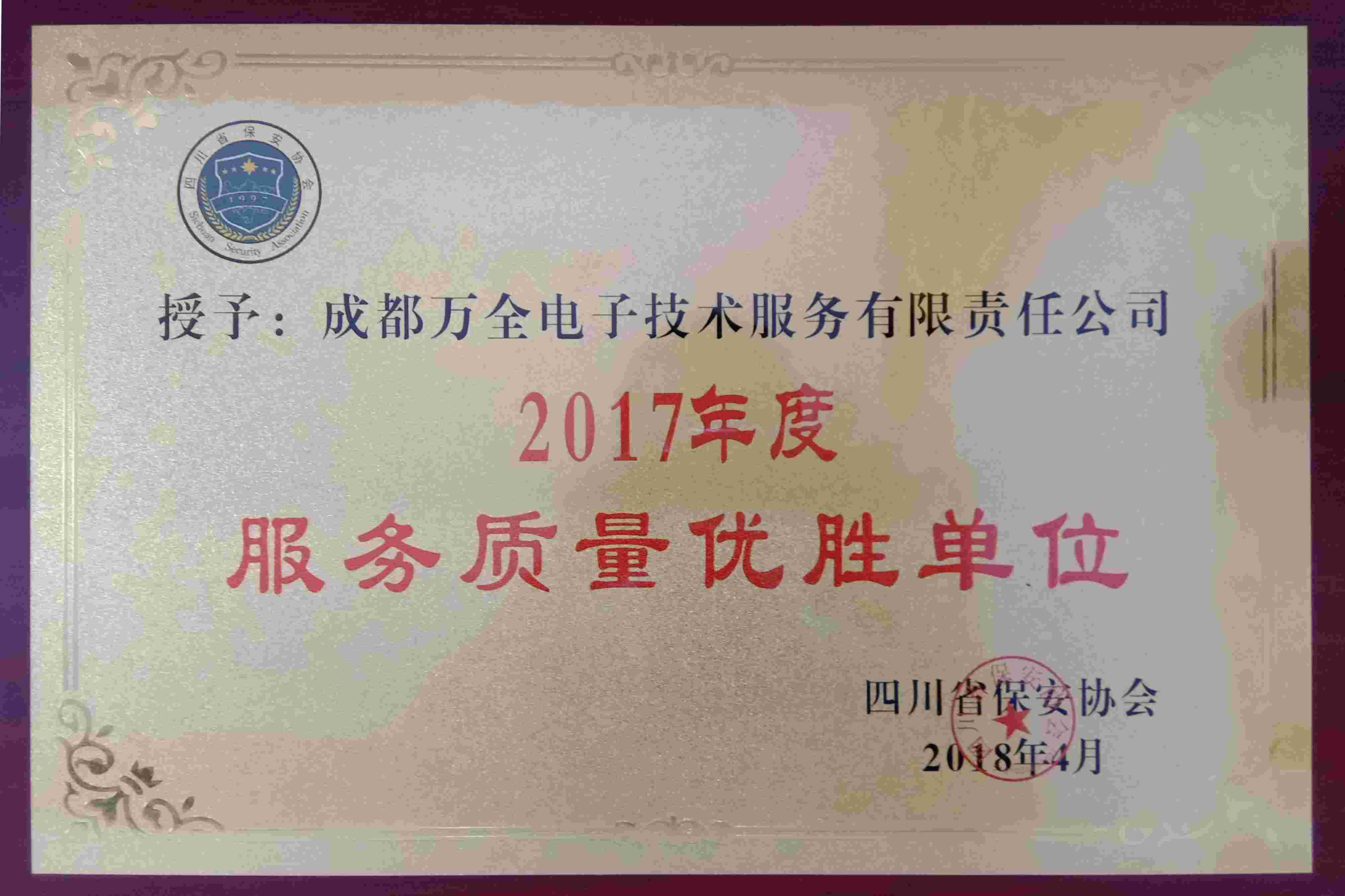 2017年4月四川省安保協(xié)會授予成都萬全電子“2017年度服務(wù)質(zhì)量優(yōu)勝單位”稱號