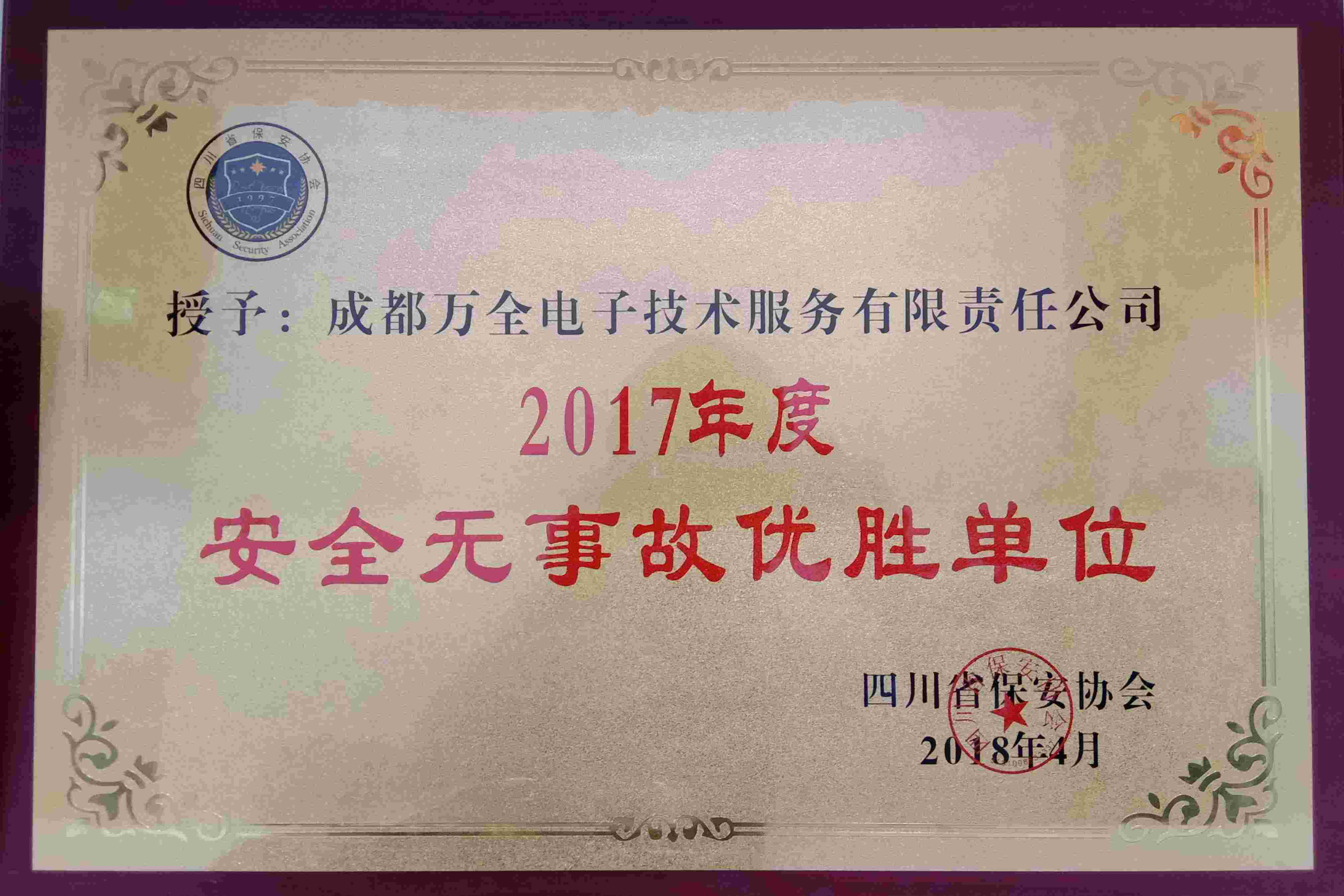 2017年4月四川省安保協(xié)會授予安防集成商成都萬全電子“2017年度安全無事故優(yōu)勝單位”稱號