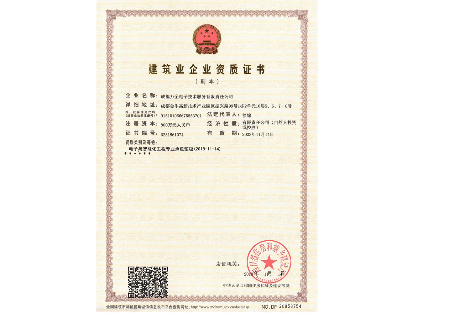 2018年11月安防工程公司成都萬全電子取得《電子與智能化工程專業(yè)承包貳級》資質(zhì)